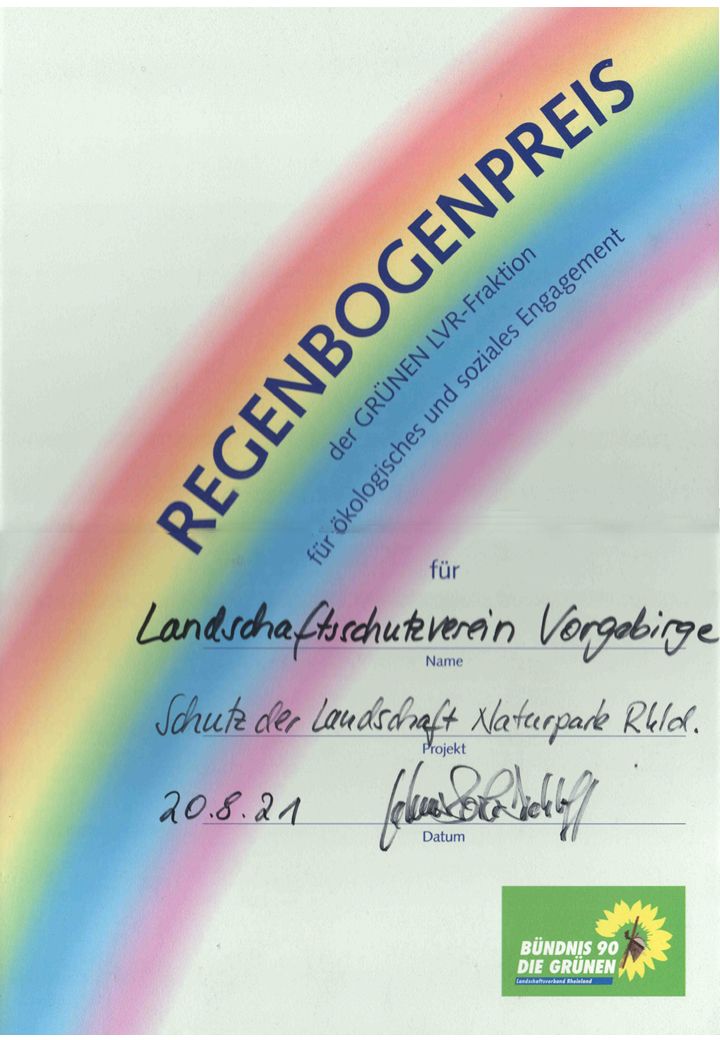 Seit einigen Jahren vergibt die GRÜNE-Fraktion im Landschaftsverband Rheinland (LVR) den „Regenbogenpreis“. Entstanden ist er aus der Idee, ehrenamtliches Engagement in allen Bereichen rund um den Erhalt der Umwelt zu fördern und zu würdigen. Im Jahr 2021 wurde der Preis u. a. auch dem Landschafts-Schutzverein Vorgebirge verliehen. Verbunden damit war ein Preisgeld von 500 €, was der LSV für die Jugendarbeit mit der LVR-Ernst-Jandl-Schule einsetzen will.