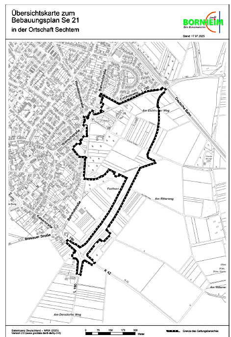 Karte Bebauungsplan Sechtem 21Die Neuausweisung eines 21,6 ha großen Wohngebietes im Außenbereich unmittelbar am südöstlichen Ortsrand von Sechtem wurde vom Rat 2020 mit der Begründung einer rückläufigen Bevölkerungsentwicklung dieser Ortschaft beschlossen. Die „Auslastung der vorhandenen Grundversorgungseinrichtungen“ sei dadurch nicht mehr gegeben (Bebauungsplan Se 21: Begründung, 17.09.2025, S. 8). Für eine Verdichtung innerhalb der bisherigen Ortschaft fehlen laut Aussage der Verwaltung geeignete Flächen. Eine Stärkung der ohne Bevölkerungszuwachs gefährdeten Infrastruktur Sechtems u.a. durch Ansiedlung eines großflächigen Lebensmittelsupermarktes (Vollversorger) zur Versorgung der Bewohner dieser einzigen Bornheimer Ortschaft in der Rheinebene in „Insellage“ sei ebenso sinnvoll wie die Neuregelung der unbefriedigenden Verkehrssituation der L 190 durch den Bau der geplanten Ortsumgehung L 190 n. Der LSV verweist in diesem Zusammenhang ausdrücklich auf die Ausführungen in seiner Stellungnahme vom 22.03.2020.